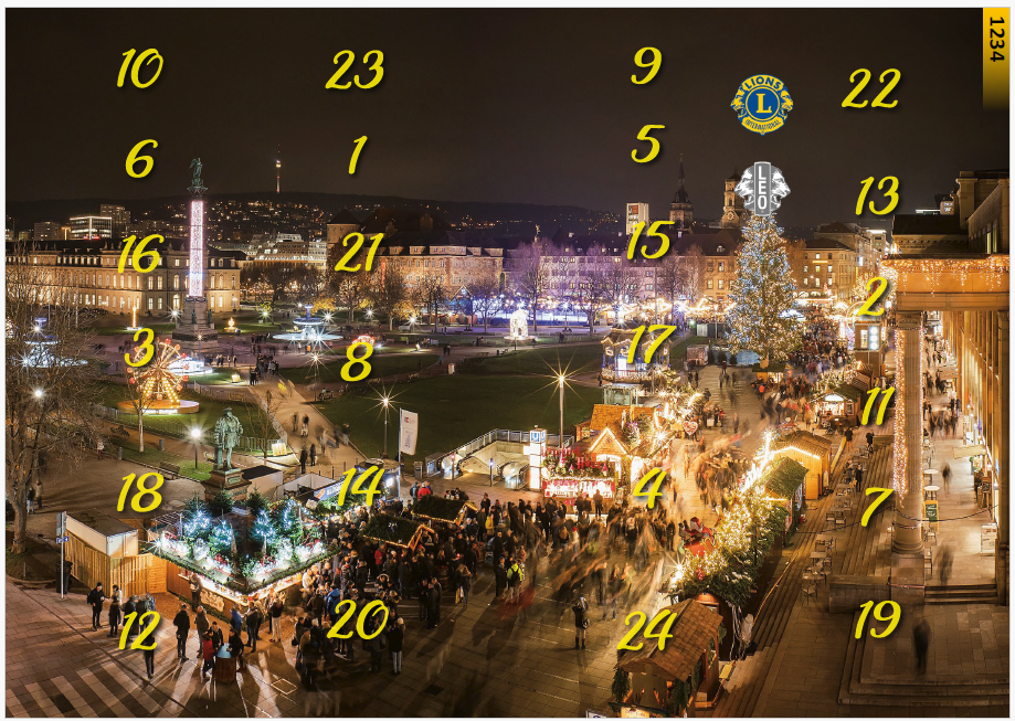 An den drei Samstagen 8., 15. und 22. November gibt es wieder die Benefiz-Adventskalender der LEOs und Lions Stuttgart, im Eingangsbereich von Tritschler am Marktplatz. Täglich gibt es etwas zu gewinnen, bis hin zu einem Goldbarren, Dank der vielen Sponsoren, für nur 5 Euro pro Kalender.