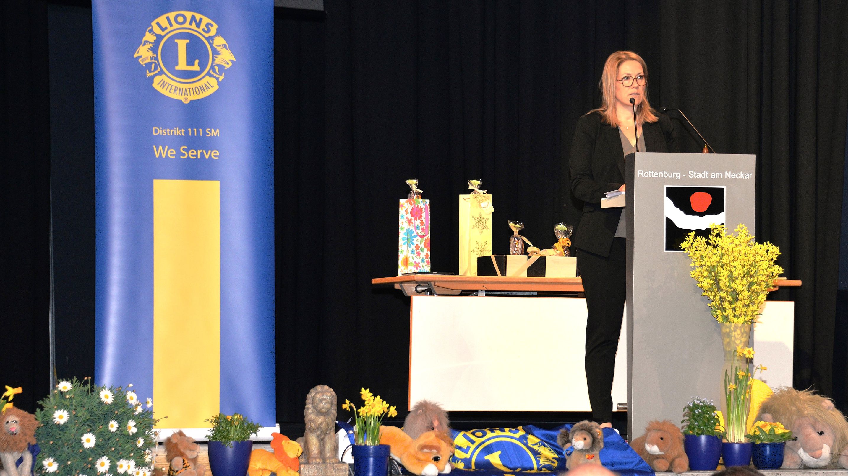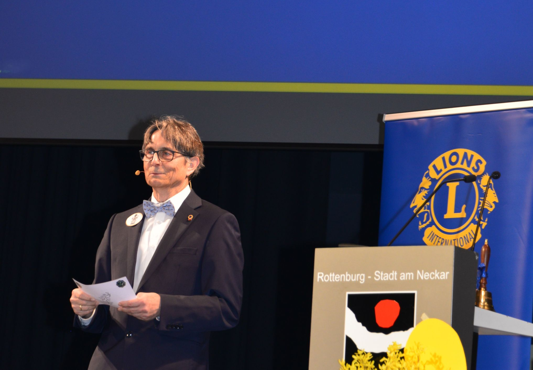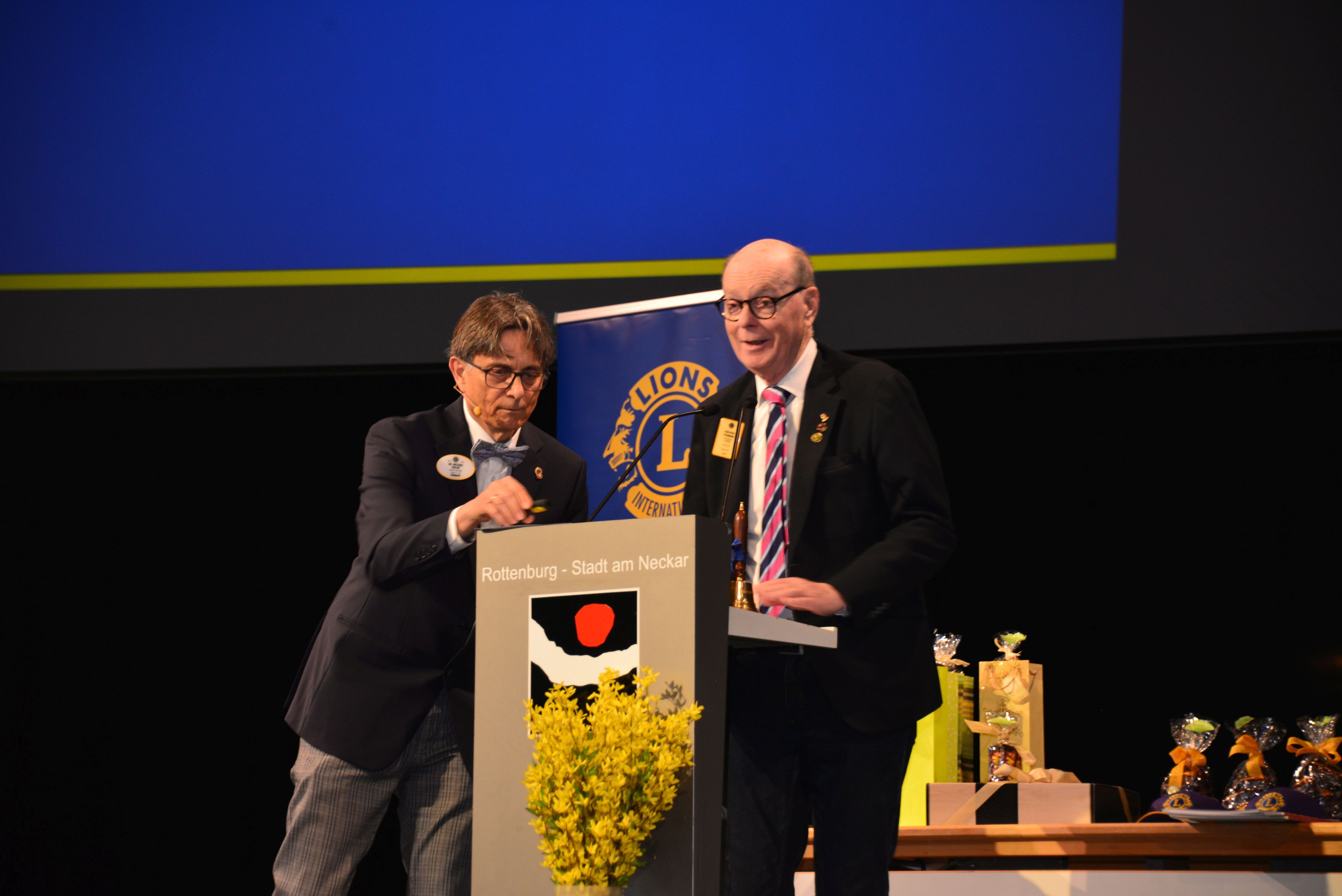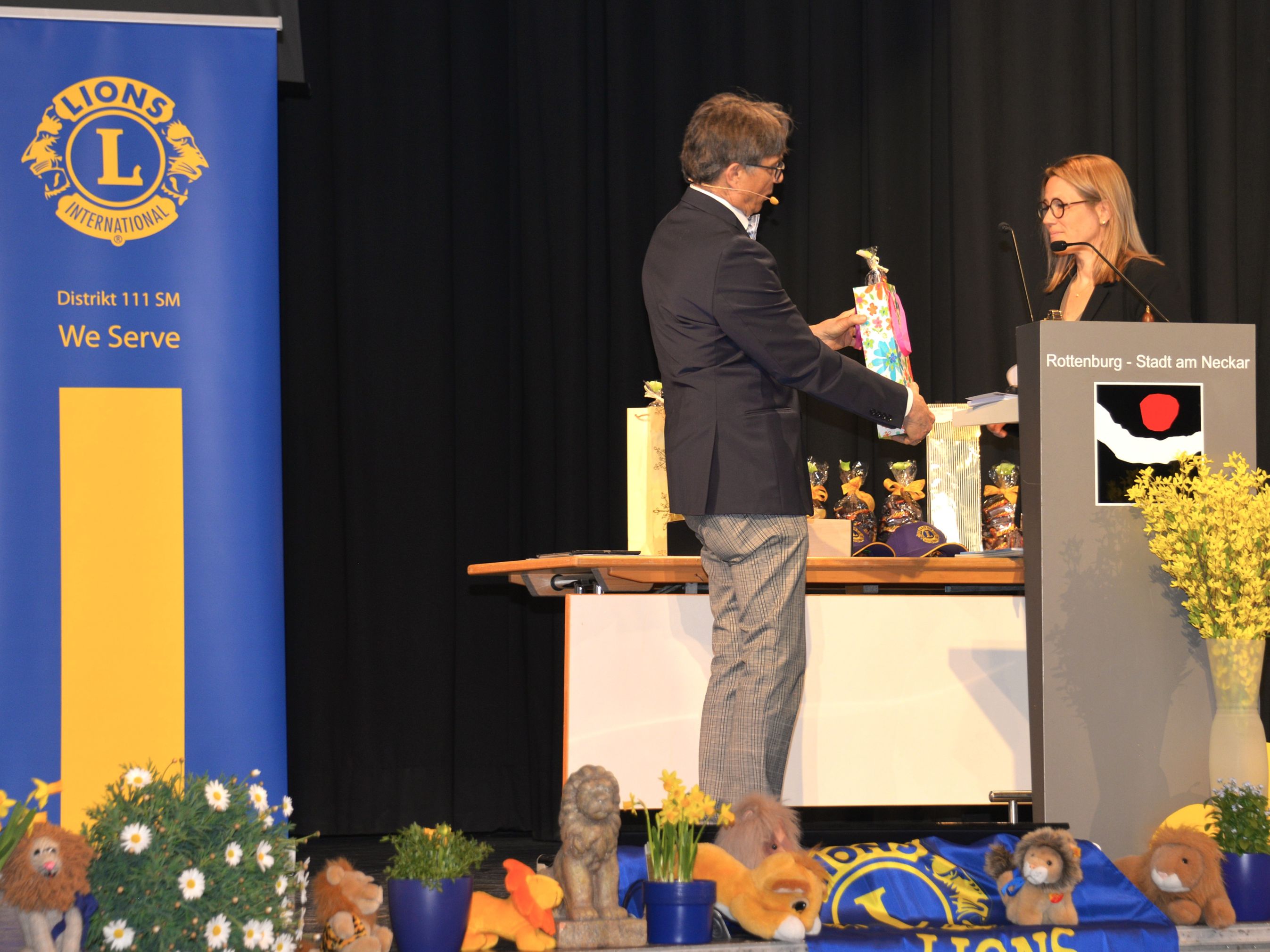 Rund 160 Lions Freundinnen und Freunde waren gekommen. Gäste: die Bürgermeisterin der großen Kreisstadt Rottenburg am Neckar Frau Annette Schwieren, die Präsidentin des Rotary Clubs Rottenburg am Neckar Frau Dr. Carmen Leichtle, die Delegation unseres französischen Jumelage-Distrikts 103 EST, 1.VG François-Xavier Baroth mit 2. VG Jean-Jacques Bernardini und PDG Jean-Paul Feldmann. Nicht zu vergessen die „Special Guests“ des DG Bella, Finn und Matti Schäfer. Der Referent des Tages war Prof. Dr. Dr. h.c. Bastian Kaiser, der Rektor der Hochschule für Forstwirtschaft Rottenburg am Neckar mit seinem Thema „Wie der Klimawandel die Waldwirtschaft beflügelt“.