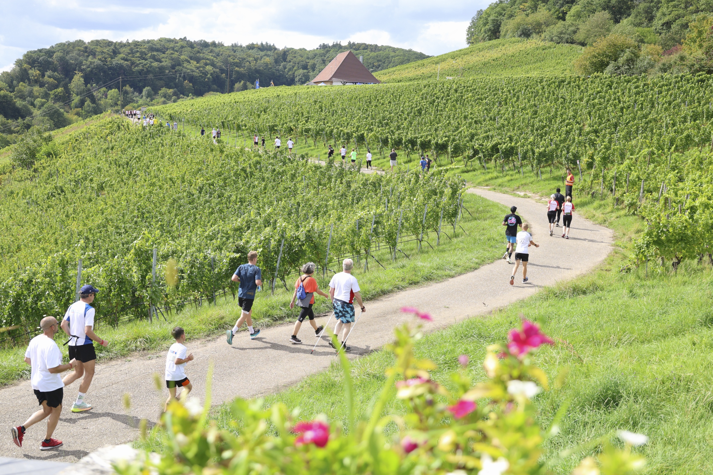 Bisher ist die Runde fast eben, dann geht’s bergab. Und wie kommt man wieder hinauf auf die Höhe des Ziels? Wie so oft im Weinberg: über Stäffele. Das ist für manche eine echte Herausforderung. Doch am Fuß der Treppe können sie sich mit Wasser versorgen oder eine kleine Pause einlegen.