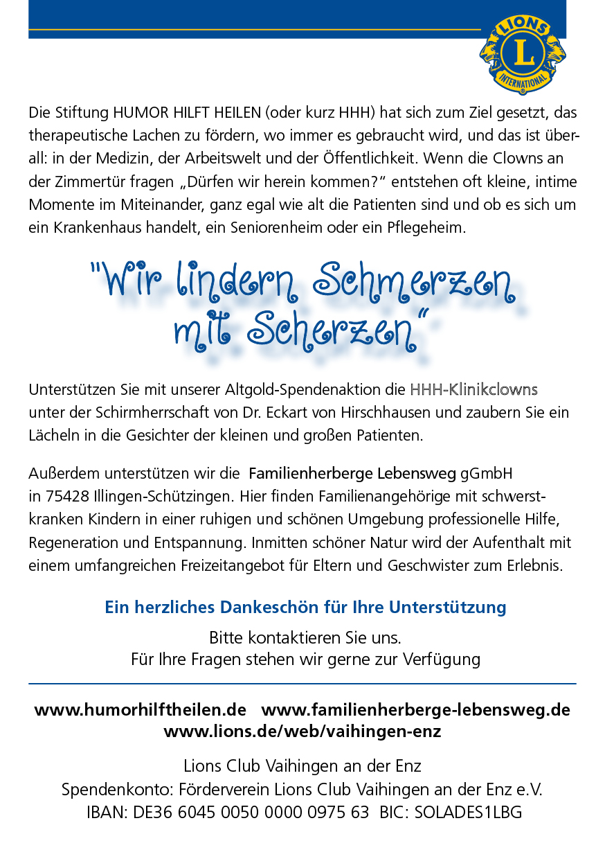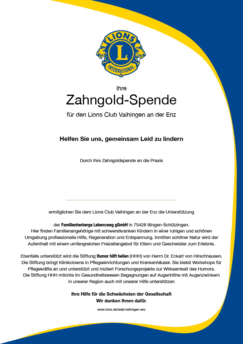 Hier finden Sie die Dokumente, wie sie der Lions-Club Vaihingen-Enz entwickelt hat. Diese Dokumente können so für Ihren Club angepasst werden, dass Sie als Ansprechpartner und aktiver Lions-Club bei den Zahnärzten auftreten.